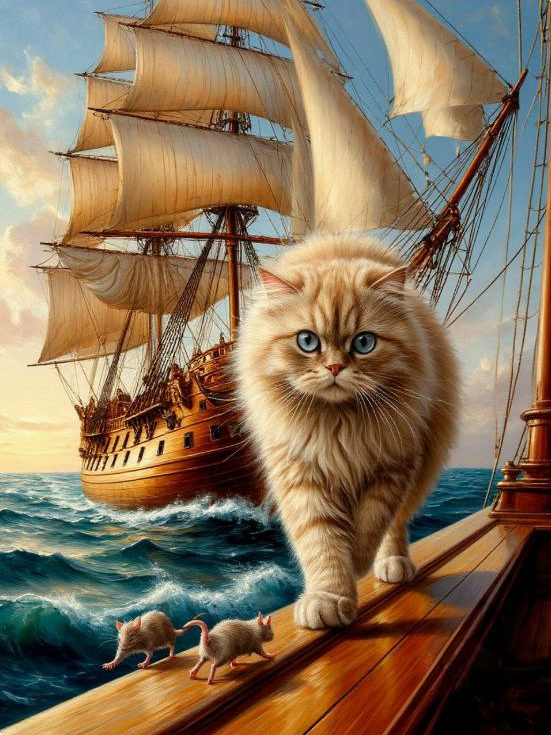 Кошачьи манеры на корабле — это отдельная история. Кот всегда держится с достоинством, важно прогуливается по палубе и снисходительно поглядывает на суетящихся крыс. Крысы же, напротив, ведут себя как невоспитанные юнги — шумят, галдят и мусорят где попало.